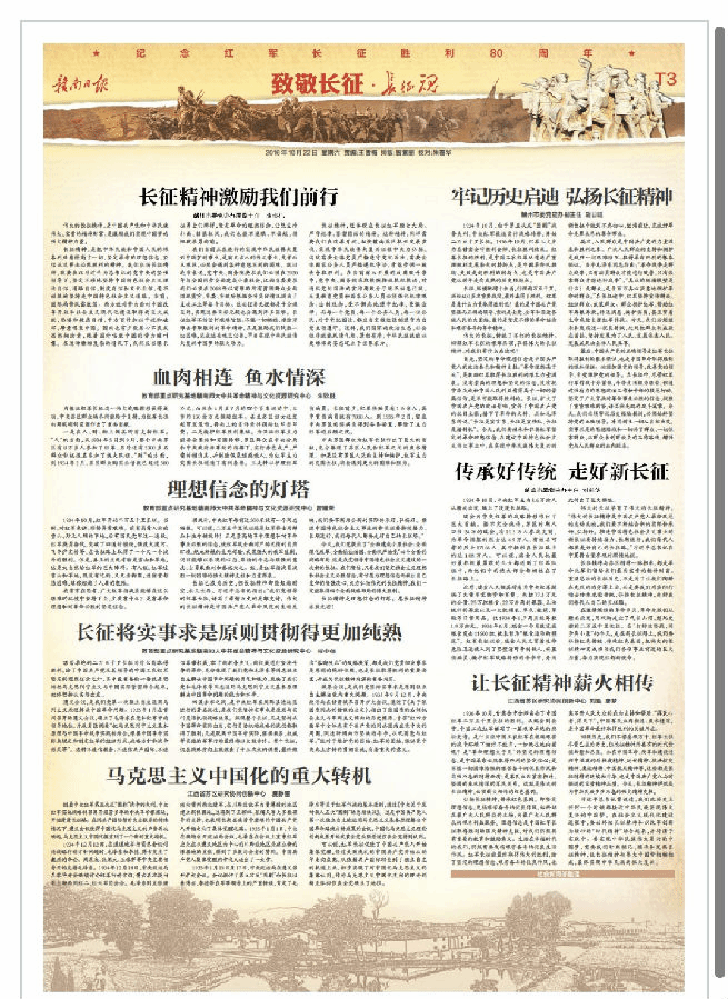在全国隆重纪念红军长征胜利80周年之际,学校教育部重点研究基地研究人员积极撰文,以理论研究的方式讴歌伟大长征、讴歌伟大长征精神。10月22日,《赣南日报》“纪念红军长征胜利80周年” 特刊专版刊发了其中5篇文章,包括基地常务副主任朱钦胜撰写的《血肉相连 鱼水情深》,基地副主任曾耀荣撰写的《理想信念的灯塔》,基地刘魁博士撰写的《让长征精神薪火相传》,基地兼职研究人员夏静雷博士撰写的《马克思主义中国化的重大转机》,基地程小强老师撰写的《长征将实事求是原则贯彻的更加纯熟》。